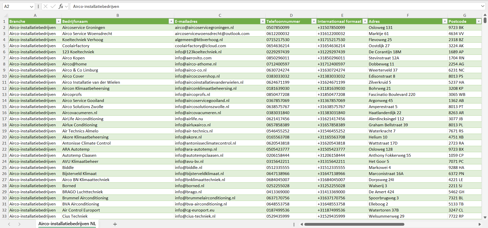 Na aankoop kun je de lijst met alle airco-installatiebedrijven in Nederland direct downloaden als Excel-bestand. Deze is geschikt voor gebruik in veelgebruikte CRM- en verkoopsoftware, zoals Salesforce, Pipedrive, HubSpot, Mailchimp, Klaviyo, ActiveCampaign en andere. Op verzoek leveren we de gegevens van de airco-installatiebedrijven ook in andere formaten, zoals CSV.