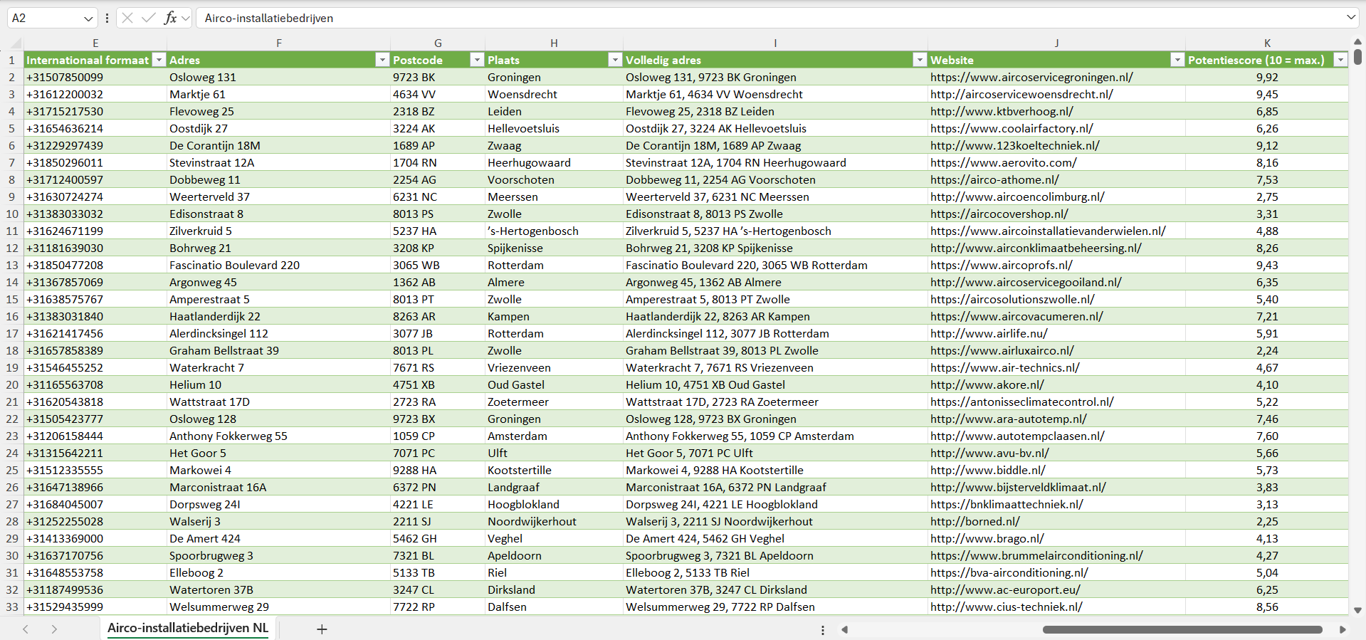 Voor elk airco-installatiebedrijf hebben we bovendien een individuele potentiescore van 1 tot 10 toegekend, gebaseerd op een reeks factoren zoals de geschatte bedrijfsgrootte, het geschatte aantal klanten en de koopkracht van de locatie.