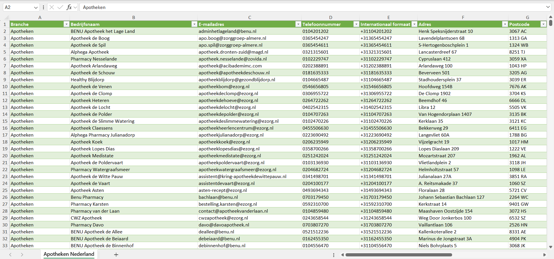 Na aankoop kun je de lijst met alle apotheken in Nederland direct downloaden als Excel-bestand. Deze is geschikt voor gebruik in veelgebruikte CRM- en verkoopsoftware, zoals Salesforce, Pipedrive, HubSpot, Mailchimp, Klaviyo, ActiveCampaign en andere. Op verzoek leveren we de gegevens van de apotheken ook in andere formaten, zoals CSV.
