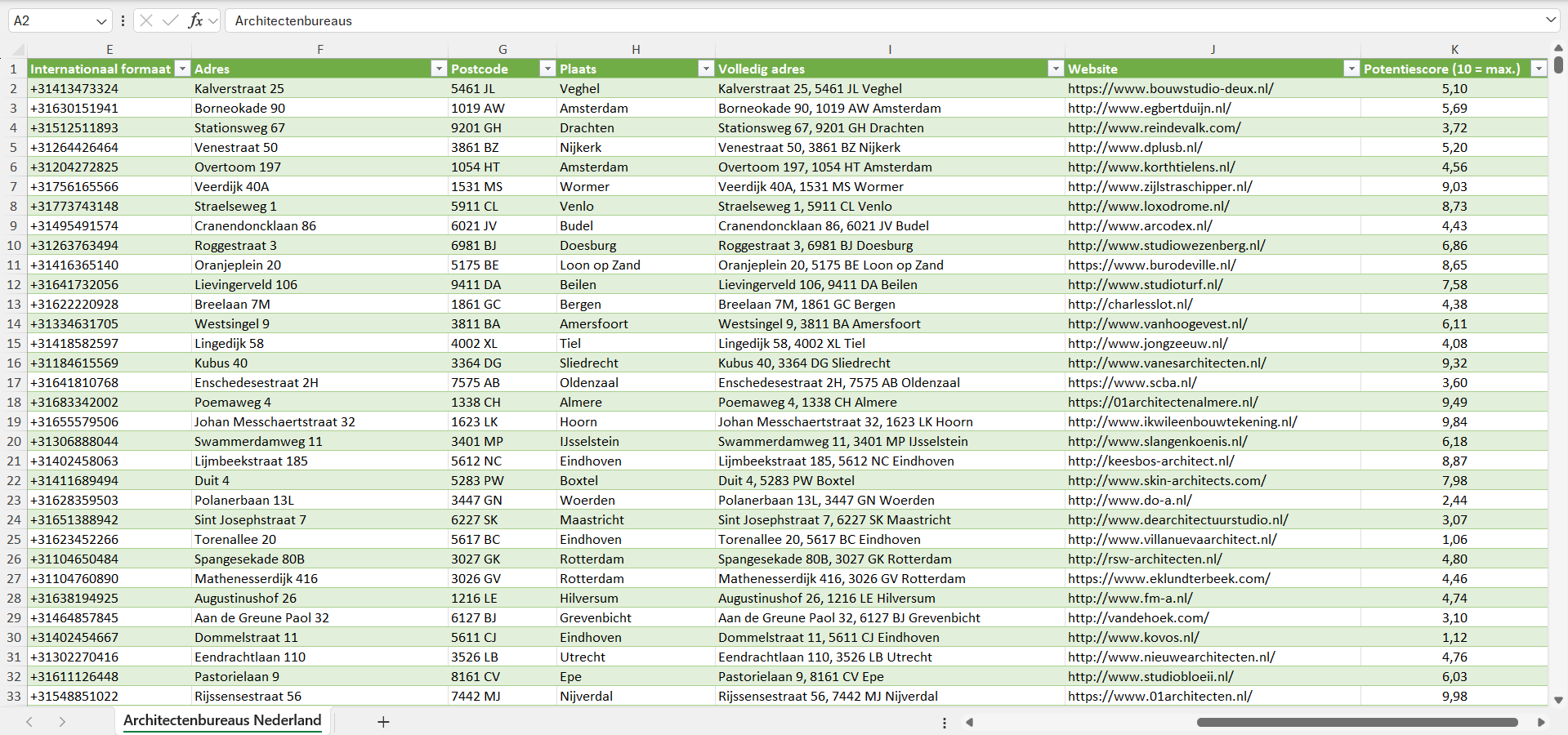 Voor elk architectenbureau hebben we bovendien een individuele potentiescore van 1 tot 10 toegekend, gebaseerd op een reeks factoren zoals de geschatte bedrijfsgrootte, het geschatte aantal klanten en de koopkracht van de locatie.