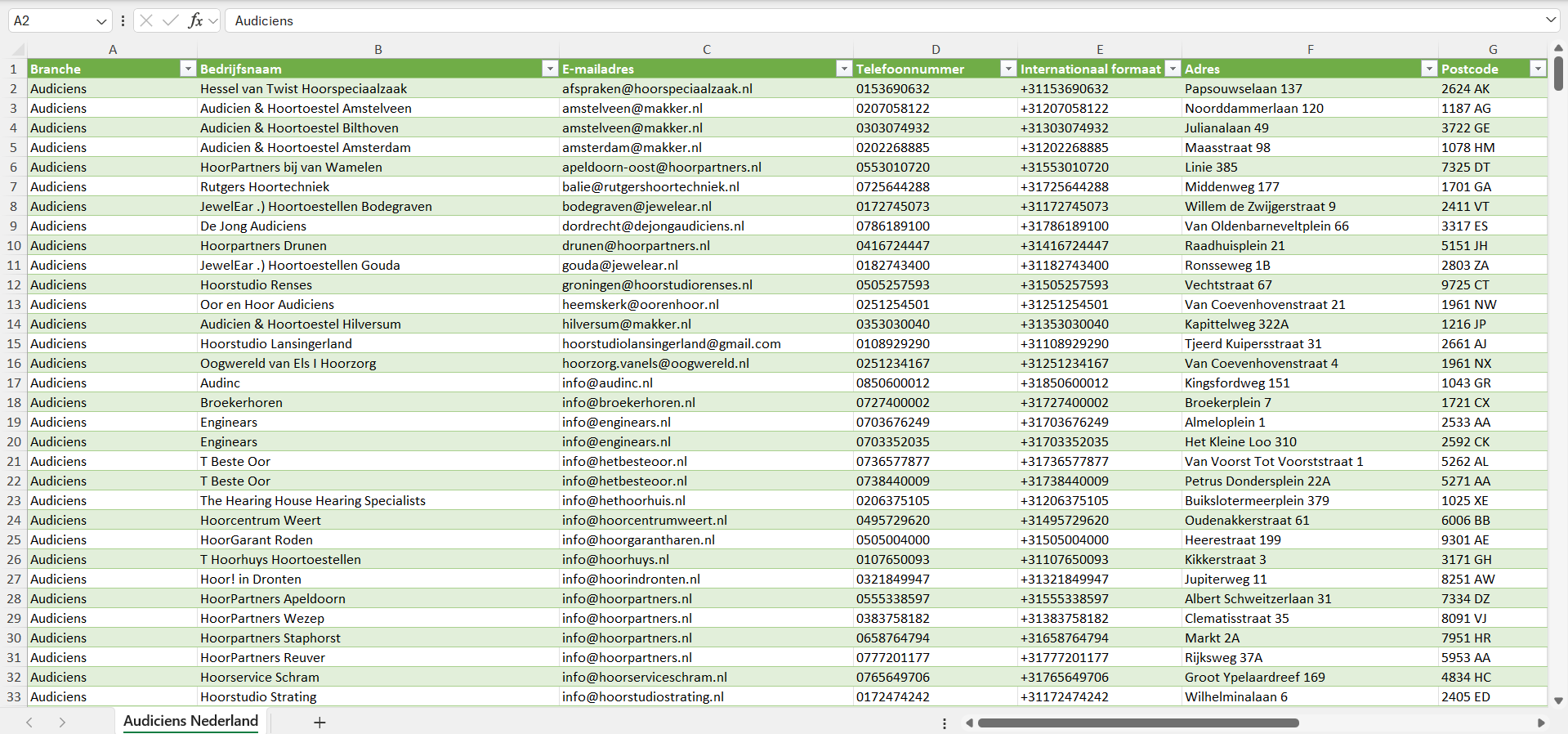 Na aankoop kun je de lijst met alle audiciens in Nederland direct downloaden als Excel-bestand. Deze is geschikt voor gebruik in veelgebruikte CRM- en verkoopsoftware, zoals Salesforce, Pipedrive, HubSpot, Mailchimp, Klaviyo, ActiveCampaign en andere. Op verzoek leveren we de gegevens van de audiciens ook in andere formaten, zoals CSV.