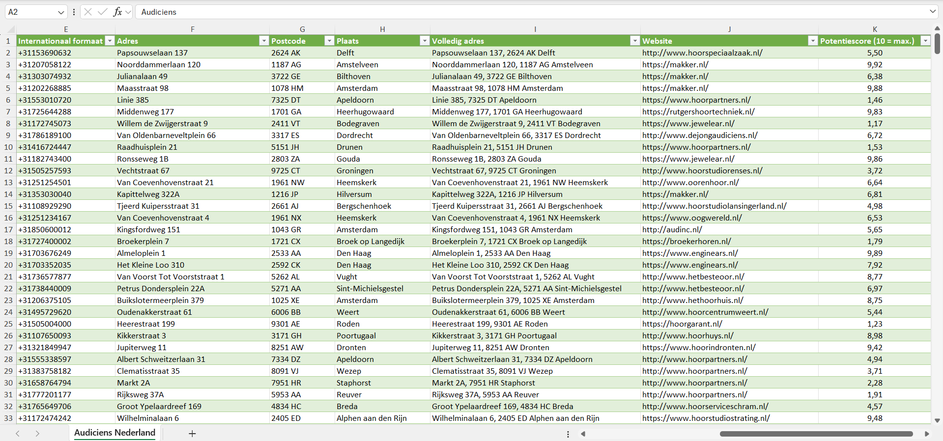 Voor elke audicien hebben we bovendien een individuele potentiescore van 1 tot 10 toegekend, gebaseerd op een reeks factoren zoals de geschatte bedrijfsgrootte, het geschatte aantal klanten en de koopkracht van de locatie.