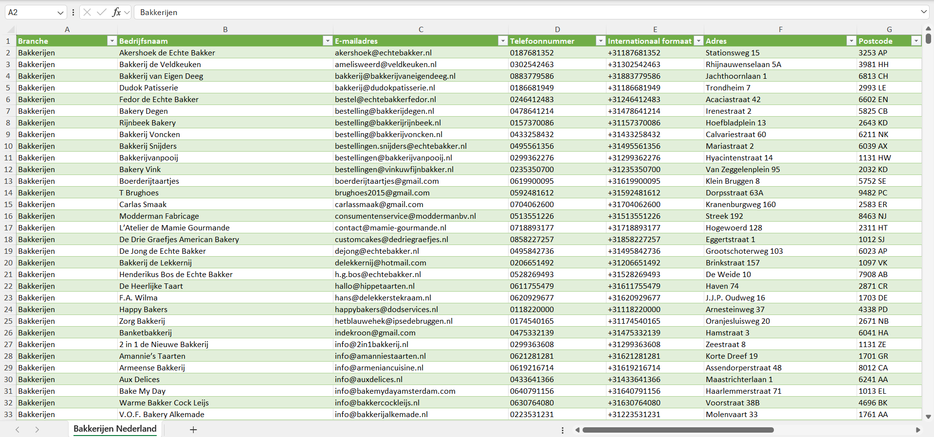 Na aankoop kun je de lijst met alle bakkerijen in Nederland direct downloaden als Excel-bestand. Deze is geschikt voor gebruik in veelgebruikte CRM- en verkoopsoftware, zoals Salesforce, Pipedrive, HubSpot, Mailchimp, Klaviyo, ActiveCampaign en andere. Op verzoek leveren we de gegevens van de bakkerijen ook in andere formaten, zoals CSV.