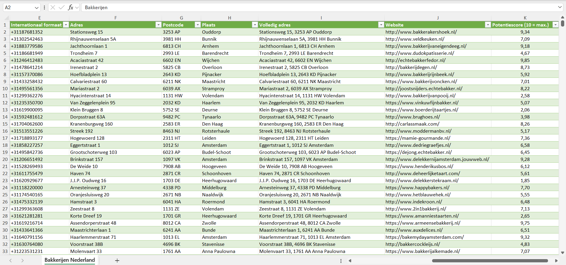 Voor elke bakkerij hebben we bovendien een individuele potentiescore van 1 tot 10 toegekend, gebaseerd op een reeks factoren zoals de geschatte bedrijfsgrootte, het geschatte aantal klanten en de koopkracht van de locatie.