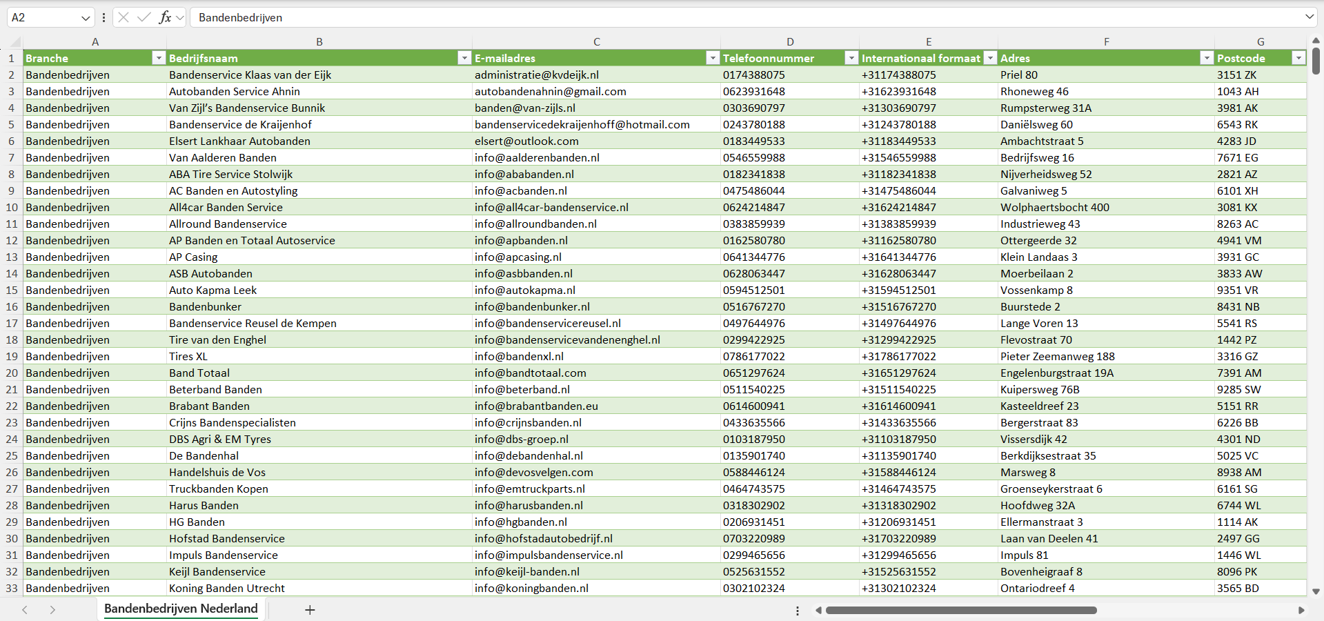 Na aankoop kun je de lijst met alle bandenbedrijven in Nederland direct downloaden als Excel-bestand. Deze is geschikt voor gebruik in veelgebruikte CRM- en verkoopsoftware, zoals Salesforce, Pipedrive, HubSpot, Mailchimp, Klaviyo, ActiveCampaign en andere. Op verzoek leveren we de gegevens van de bandenbedrijven ook in andere formaten, zoals CSV.