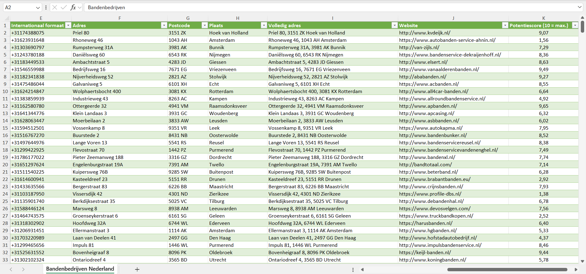 Voor elk bandenbedrijf hebben we bovendien een individuele potentiescore van 1 tot 10 toegekend, gebaseerd op een reeks factoren zoals de geschatte bedrijfsgrootte, het geschatte aantal klanten en de koopkracht van de locatie.