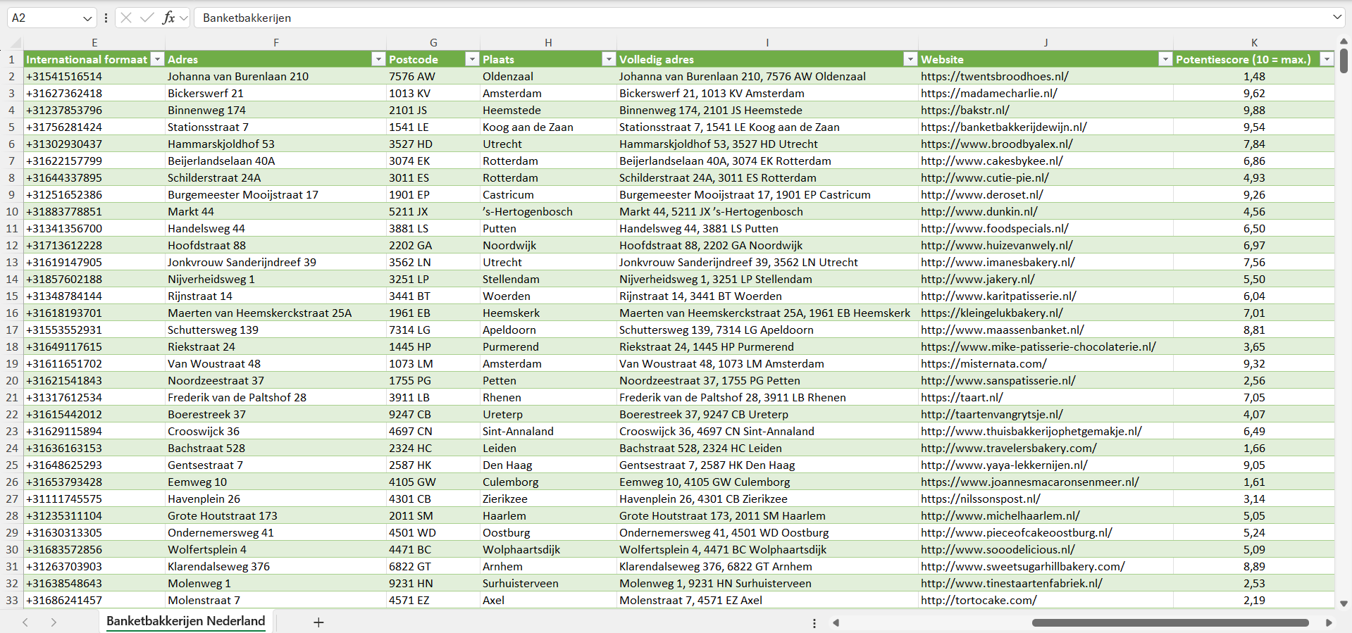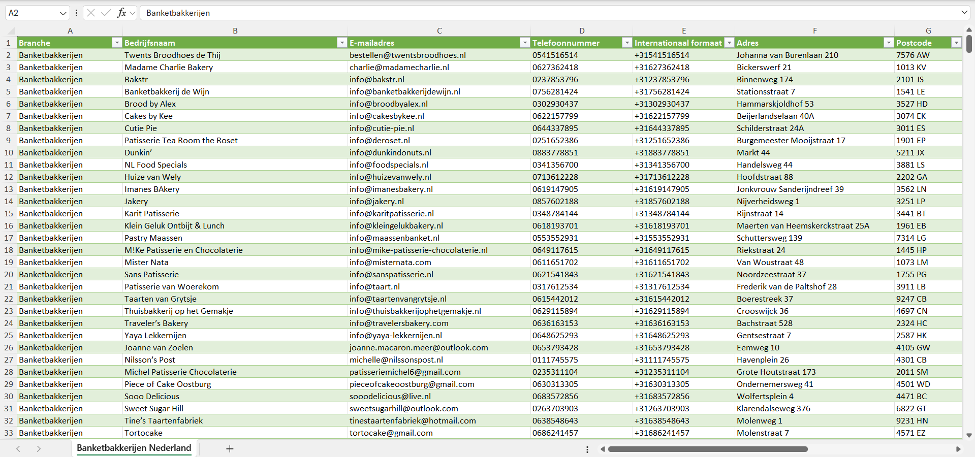 Na aankoop kun je de lijst met alle banketbakkerijen in Nederland direct downloaden als Excel-bestand. Deze is geschikt voor gebruik in veelgebruikte CRM- en verkoopsoftware, zoals Salesforce, Pipedrive, HubSpot, Mailchimp, Klaviyo, ActiveCampaign en andere. Op verzoek leveren we de gegevens van de banketbakkerijen ook in andere formaten, zoals CSV.