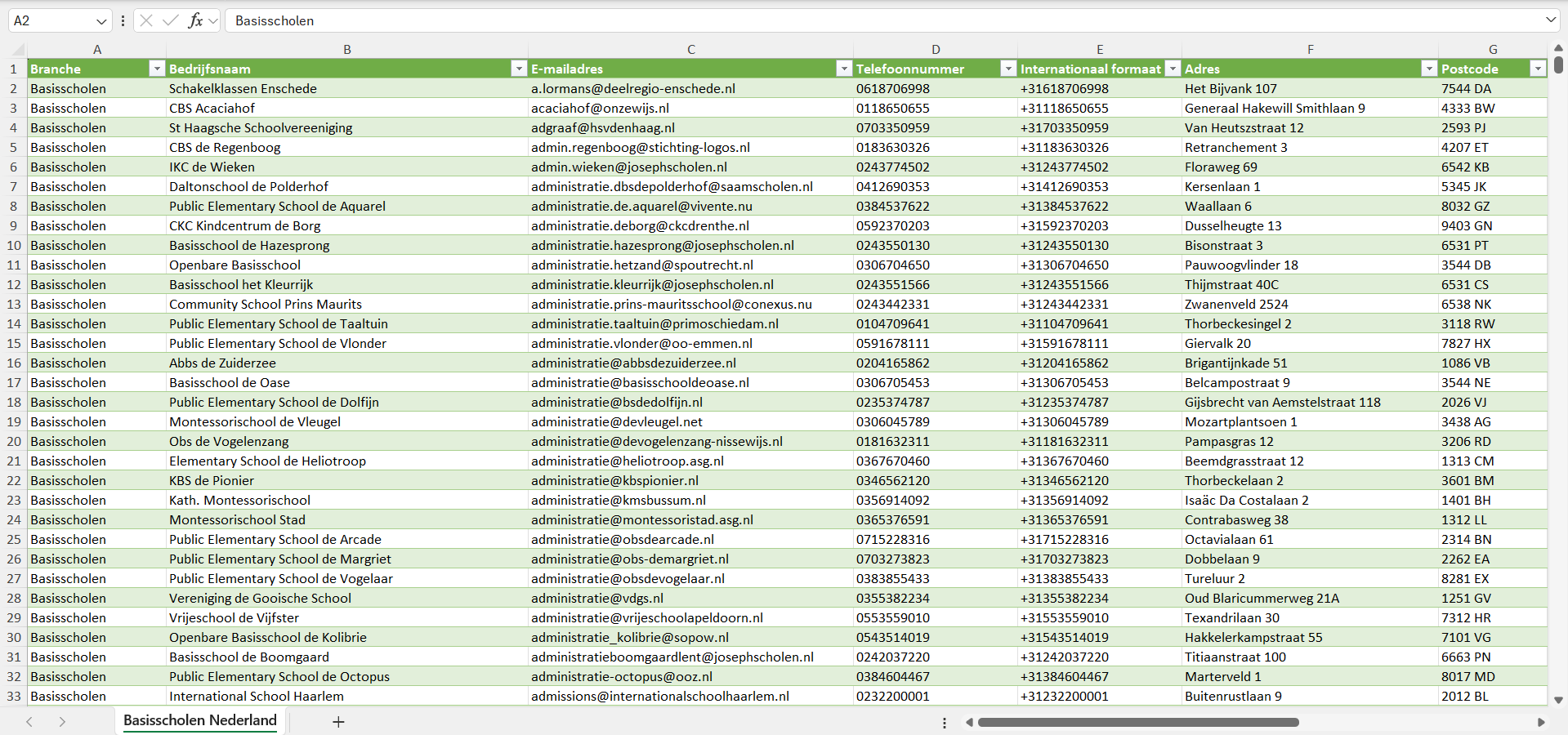 Na aankoop kun je de lijst met alle basisscholen in Nederland direct downloaden als Excel-bestand. Deze is geschikt voor gebruik in veelgebruikte CRM- en verkoopsoftware, zoals Salesforce, Pipedrive, HubSpot, Mailchimp, Klaviyo, ActiveCampaign en andere. Op verzoek leveren we de gegevens van de basisscholen ook in andere formaten, zoals CSV.