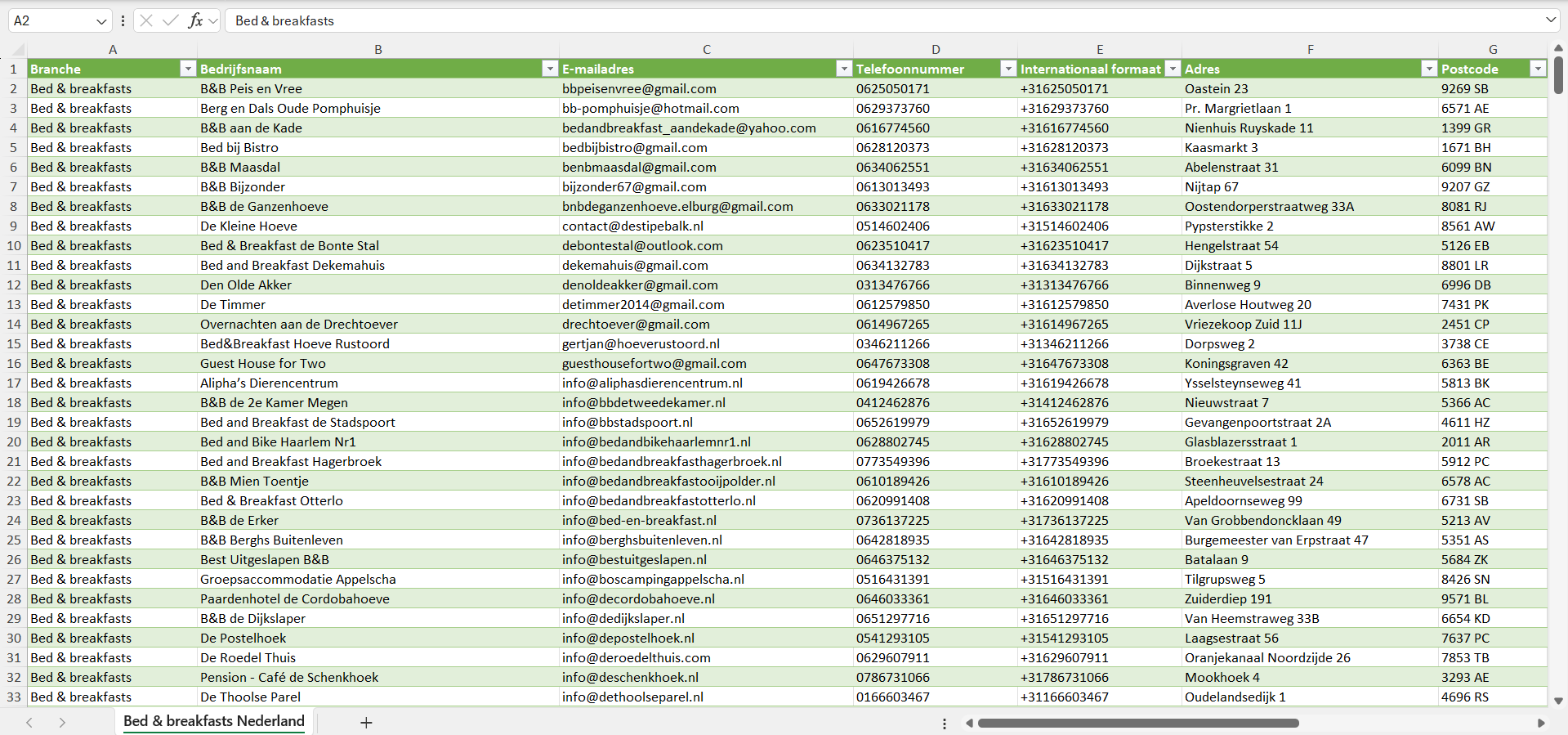 Na aankoop kun je de lijst met alle bed & breakfasts in Nederland direct downloaden als Excel-bestand. Deze is geschikt voor gebruik in veelgebruikte CRM- en verkoopsoftware, zoals Salesforce, Pipedrive, HubSpot, Mailchimp, Klaviyo, ActiveCampaign en andere. Op verzoek leveren we de gegevens van de bed & breakfasts ook in andere formaten, zoals CSV.