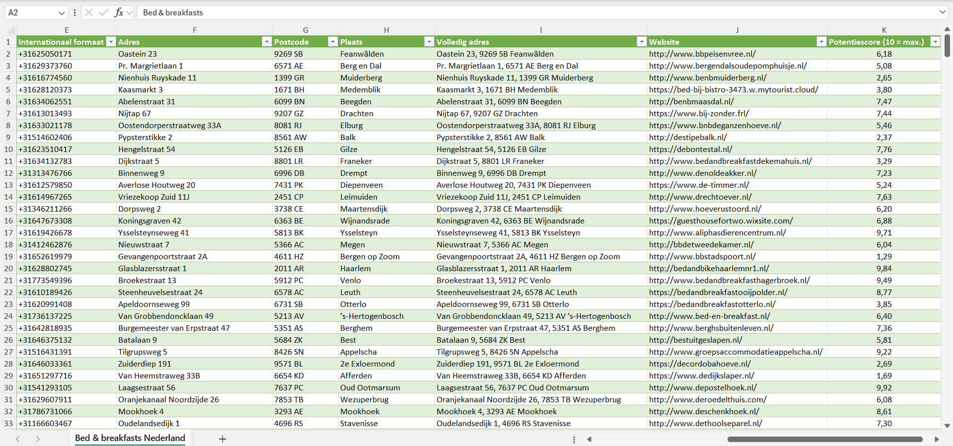 Voor elk bed & breakfast hebben we bovendien een individuele potentiescore van 1 tot 10 toegekend, gebaseerd op een reeks factoren zoals de geschatte grootte, het geschatte aantal gasten en de koopkracht van de locatie.