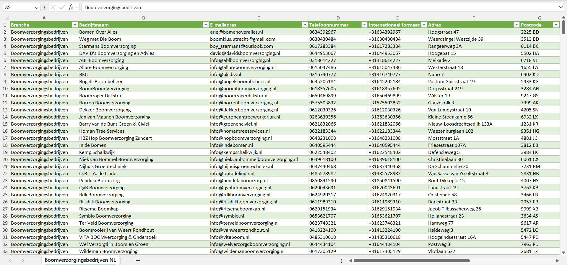 Na aankoop kun je de lijst met alle boomverzorgingsbedrijven in Nederland direct downloaden als Excel-bestand. Deze is geschikt voor gebruik in veelgebruikte CRM- en verkoopsoftware, zoals Salesforce, Pipedrive, HubSpot, Mailchimp, Klaviyo, ActiveCampaign en andere. Op verzoek leveren we de gegevens van de boomverzorgingsbedrijven ook in andere formaten, zoals CSV.