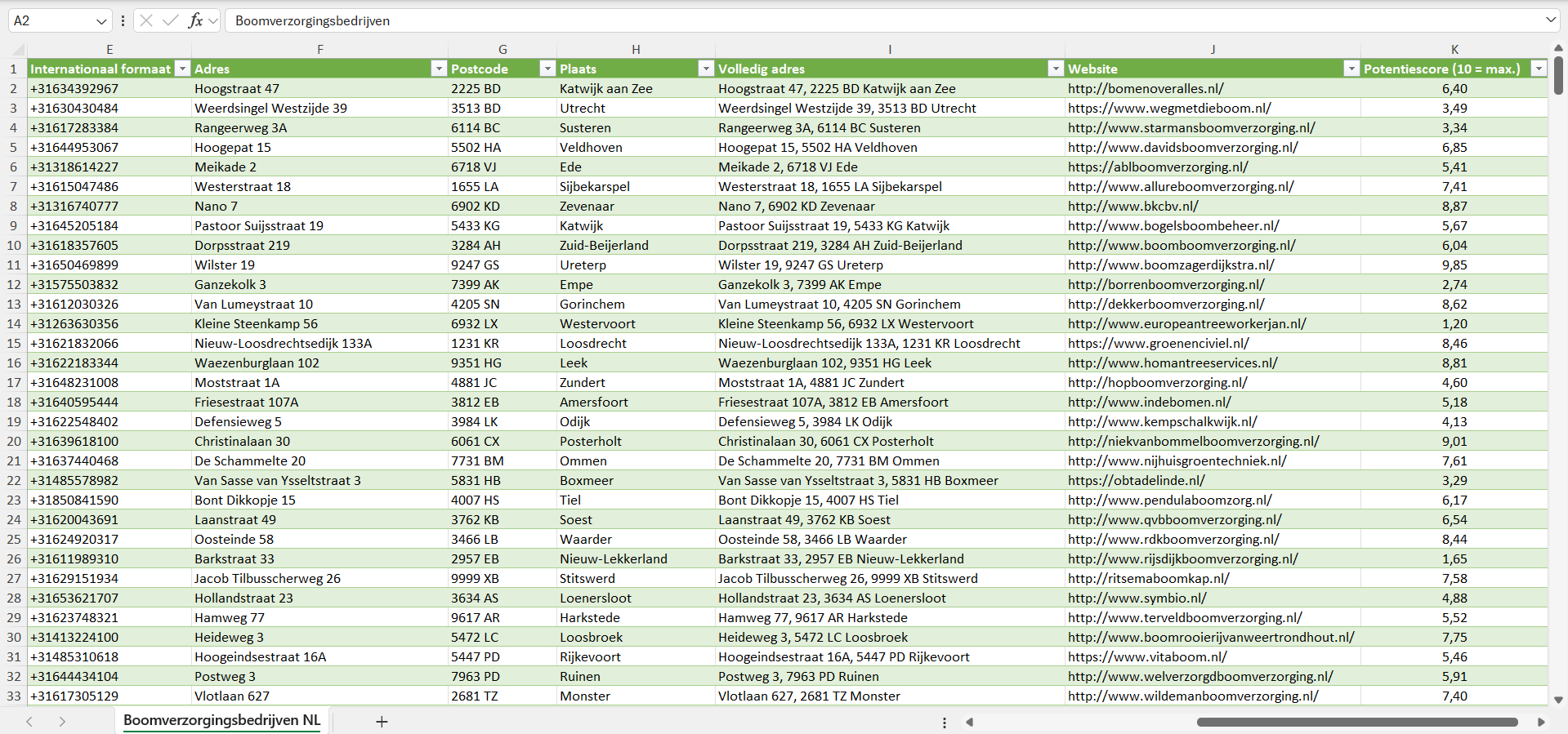 Voor elk boomverzorgingsbedrijf hebben we bovendien een individuele potentiescore van 1 tot 10 toegekend, gebaseerd op een reeks factoren zoals de geschatte bedrijfsgrootte, het geschatte aantal klanten en de koopkracht van de locatie.