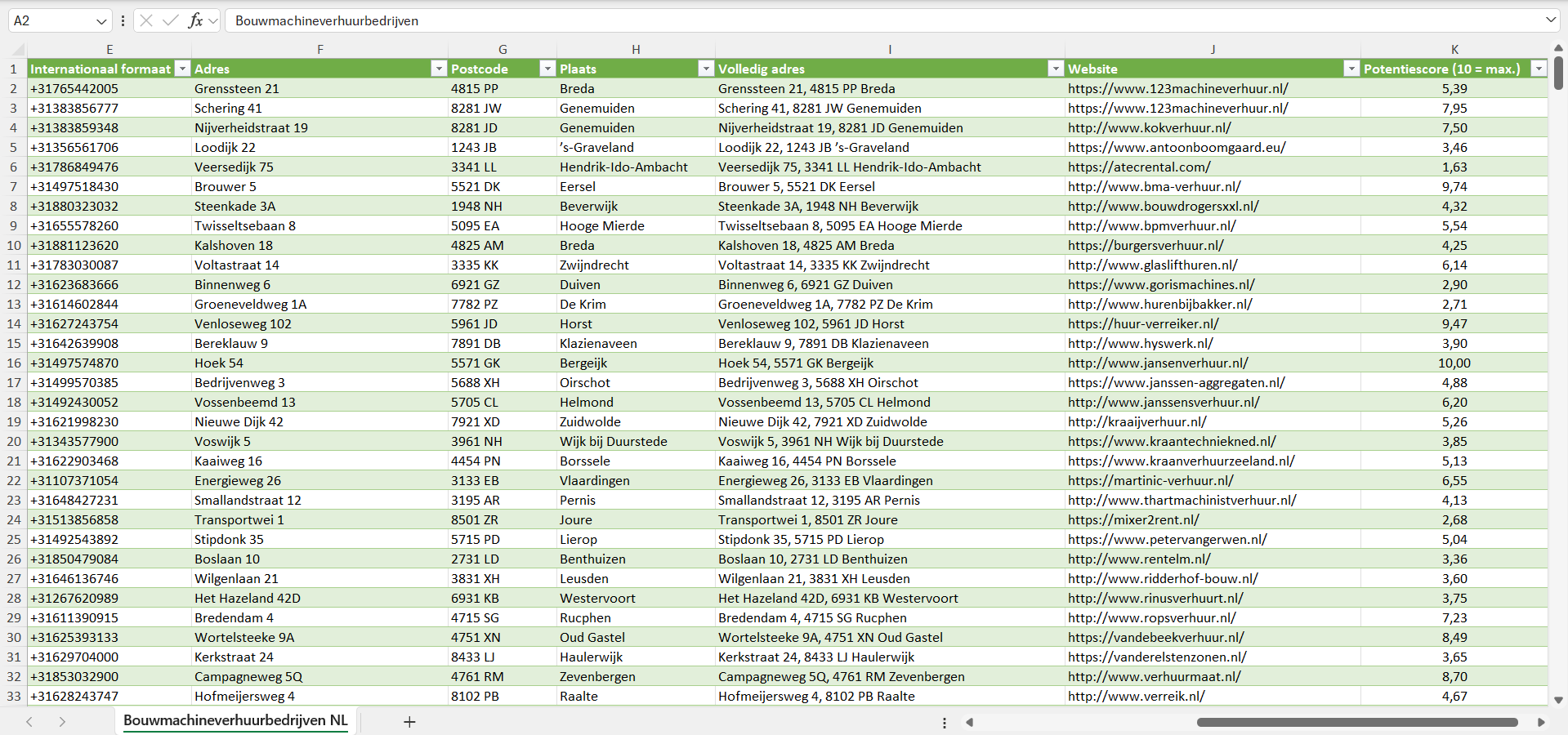 Voor elk bouwmachineverhuurbedrijf hebben we bovendien een individuele potentiescore van 1 tot 10 toegekend, gebaseerd op een reeks factoren zoals de geschatte bedrijfsgrootte, het geschatte aantal klanten en de koopkracht van de locatie.