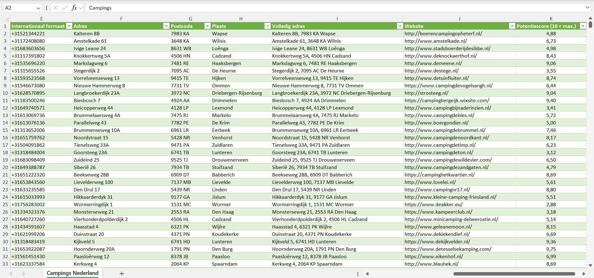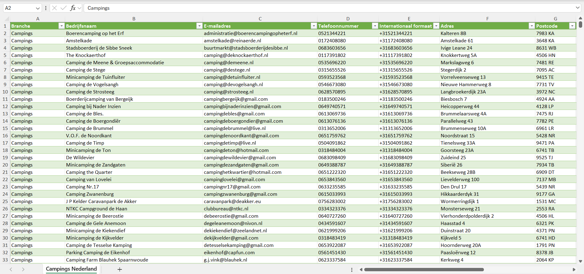 Na aankoop kun je de lijst met alle campings in Nederland direct downloaden als Excel-bestand. Deze is geschikt voor gebruik in veelgebruikte CRM- en verkoopsoftware, zoals Salesforce, Pipedrive, HubSpot, Mailchimp, Klaviyo, ActiveCampaign en andere. Op verzoek leveren we de gegevens van de campings ook in andere formaten, zoals CSV.