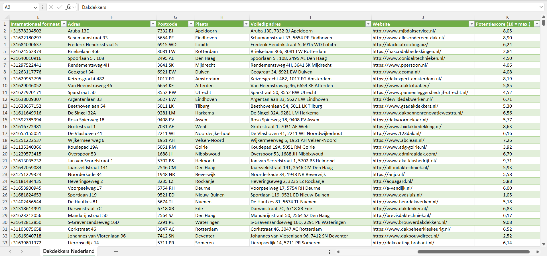 Voor elke dakdekker hebben we bovendien een individuele potentiescore van 1 tot 10 toegekend, gebaseerd op een reeks factoren zoals de geschatte bedrijfsgrootte, het geschatte aantal klanten en de koopkracht van de locatie.