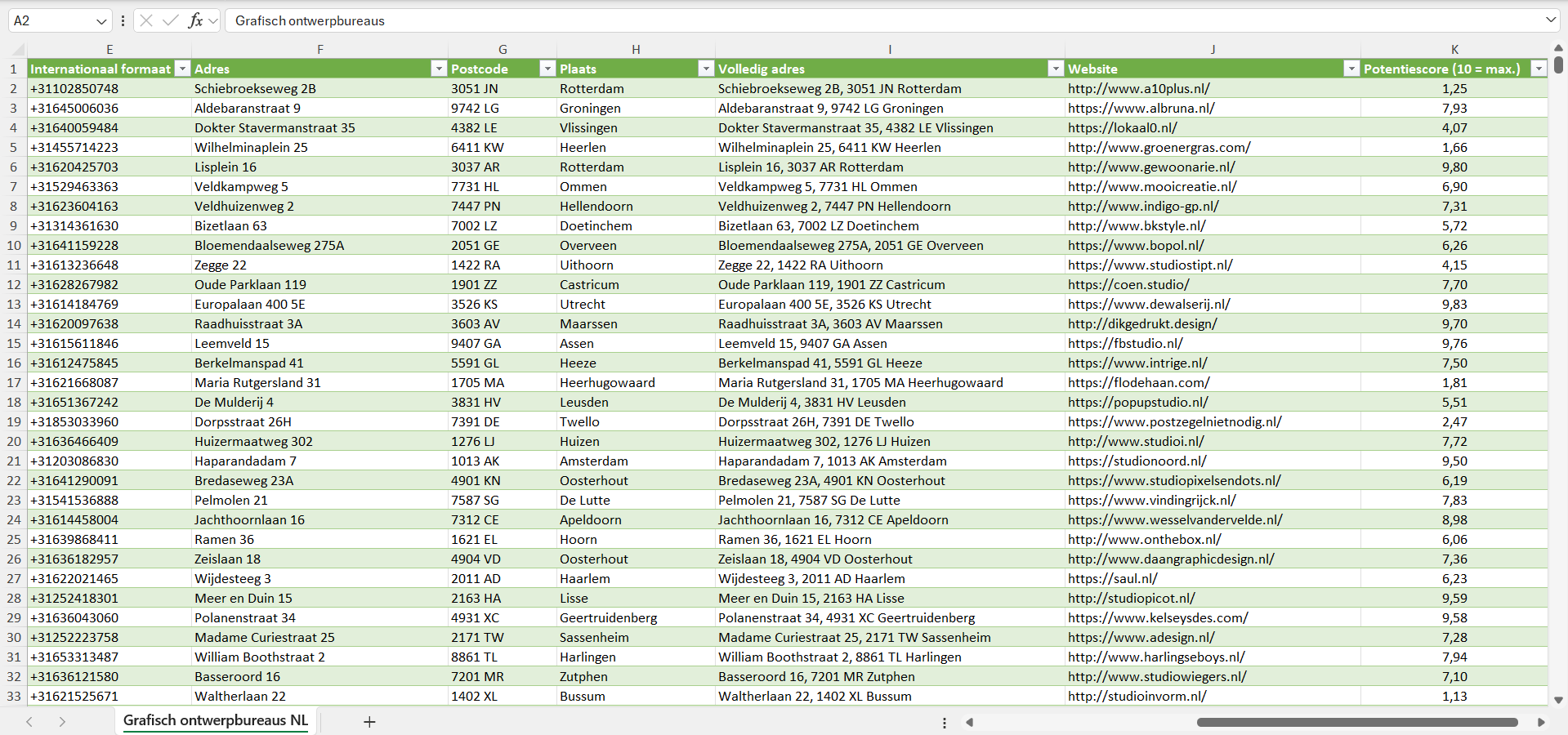 Voor elk grafisch ontwerpbureau hebben we bovendien een individuele potentiescore van 1 tot 10 toegekend, gebaseerd op een reeks factoren zoals de geschatte bedrijfsgrootte, het geschatte aantal klanten en de koopkracht van de locatie.