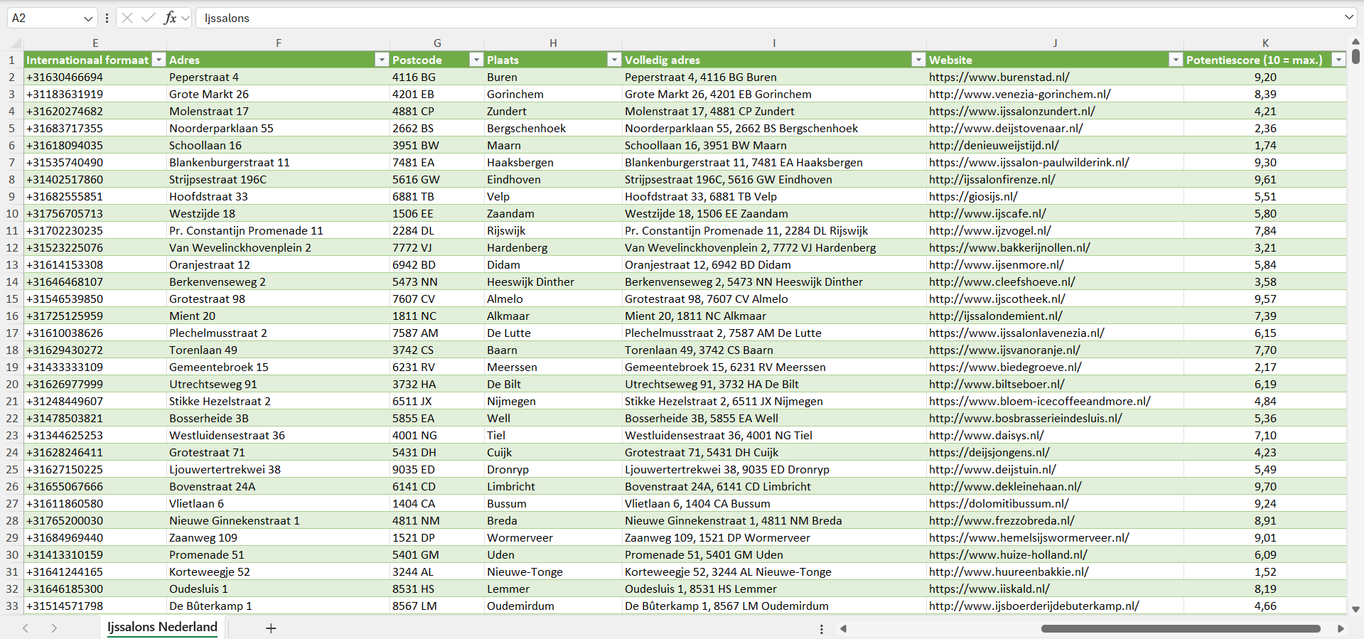 Voor elke ijssalon hebben we bovendien een individuele potentiescore van 1 tot 10 toegekend, gebaseerd op een reeks factoren zoals de geschatte bedrijfsgrootte, het geschatte aantal klanten en de koopkracht van de locatie.