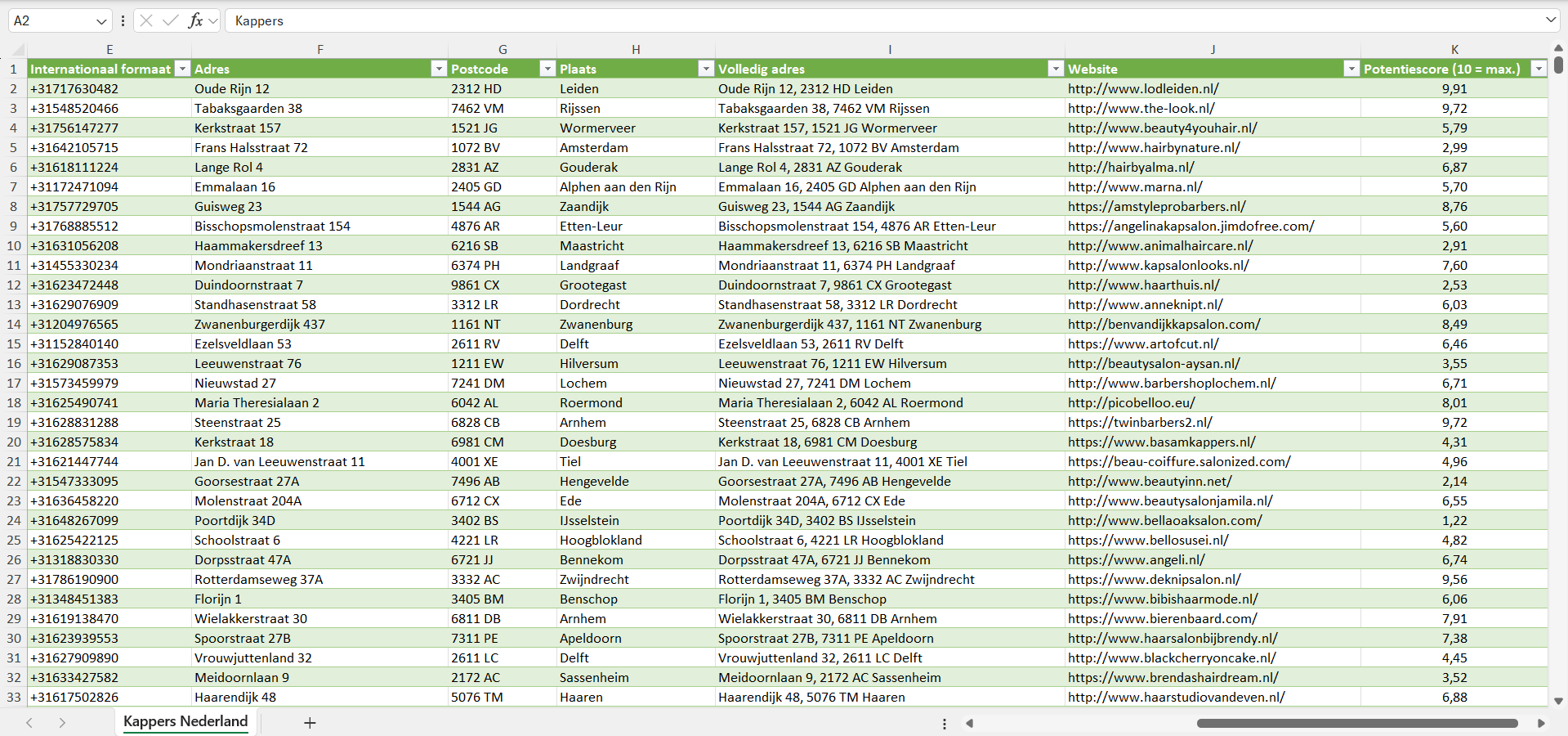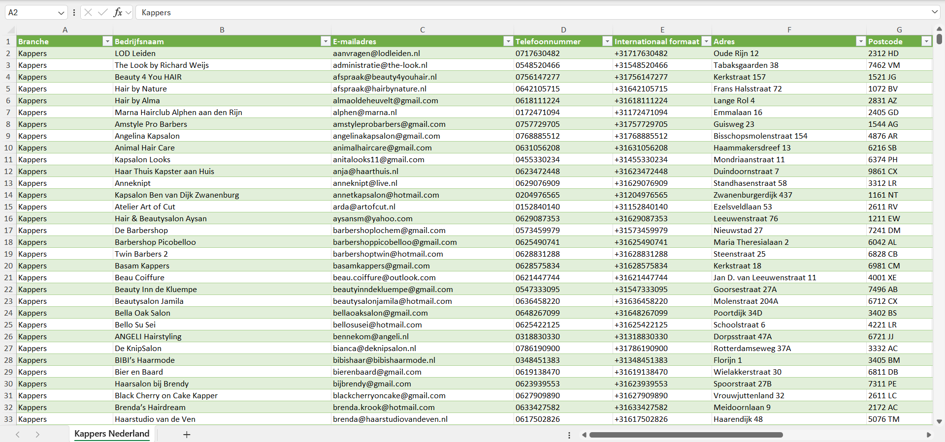 Na aankoop kun je de lijst met alle kappers in Nederland direct downloaden als Excel-bestand. Deze is geschikt voor gebruik in veelgebruikte CRM- en verkoopsoftware, zoals Salesforce, Pipedrive, HubSpot, Mailchimp, Klaviyo, ActiveCampaign en andere. Op verzoek leveren we de gegevens van de kappers ook in andere formaten, zoals CSV.