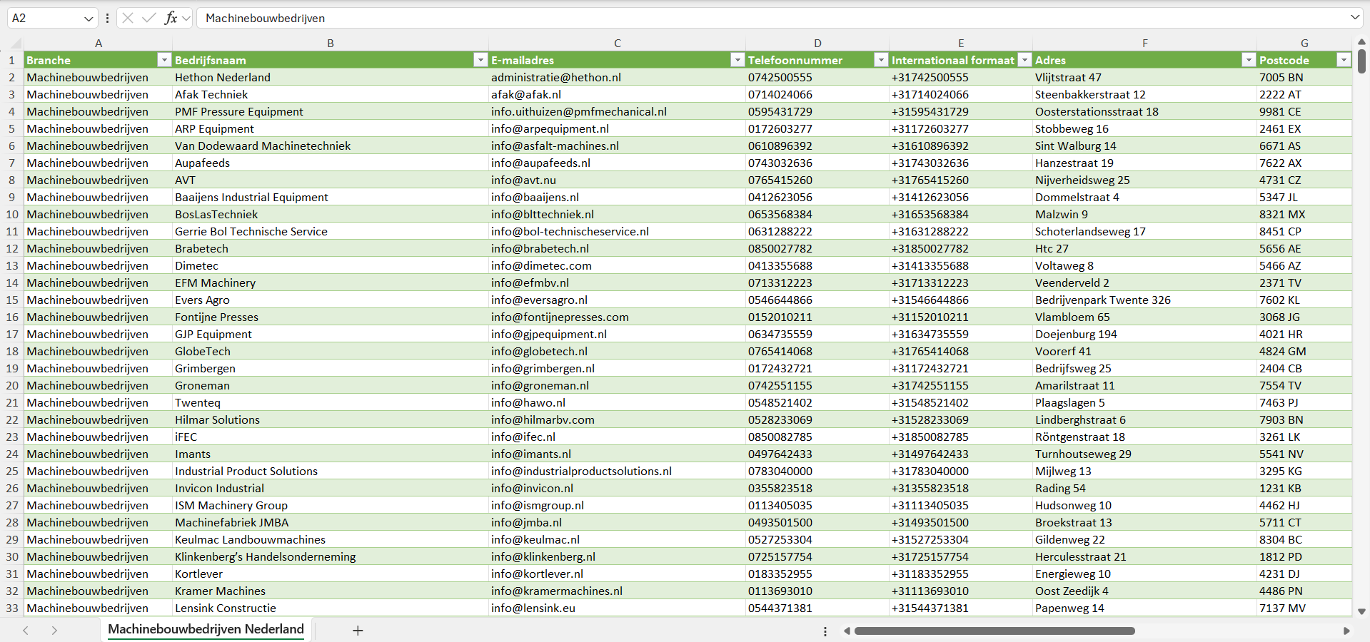 Na aankoop kun je de lijst met alle machinebouwbedrijven in Nederland direct downloaden als Excel-bestand. Deze is geschikt voor gebruik in veelgebruikte CRM- en verkoopsoftware, zoals Salesforce, Pipedrive, HubSpot, Mailchimp, Klaviyo, ActiveCampaign en andere. Op verzoek leveren we de gegevens van de machinebouwbedrijven ook in andere formaten, zoals CSV.