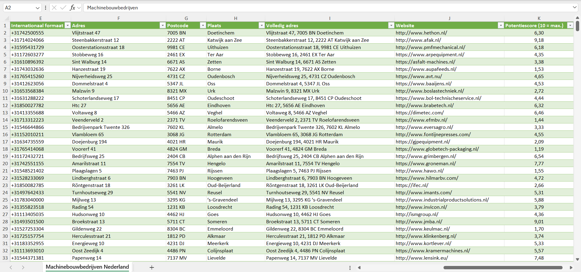 Voor elk machinebouwbedrijf hebben we bovendien een individuele potentiescore van 1 tot 10 toegekend, gebaseerd op een reeks factoren zoals de geschatte bedrijfsgrootte, het geschatte aantal klanten en de koopkracht van de locatie.