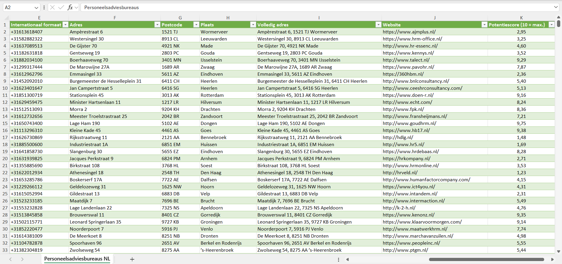 Voor elk personeelsadviesbureau hebben we bovendien een individuele potentiescore van 1 tot 10 toegekend, gebaseerd op een reeks factoren zoals de geschatte bedrijfsgrootte, het geschatte aantal klanten en de koopkracht van de locatie.