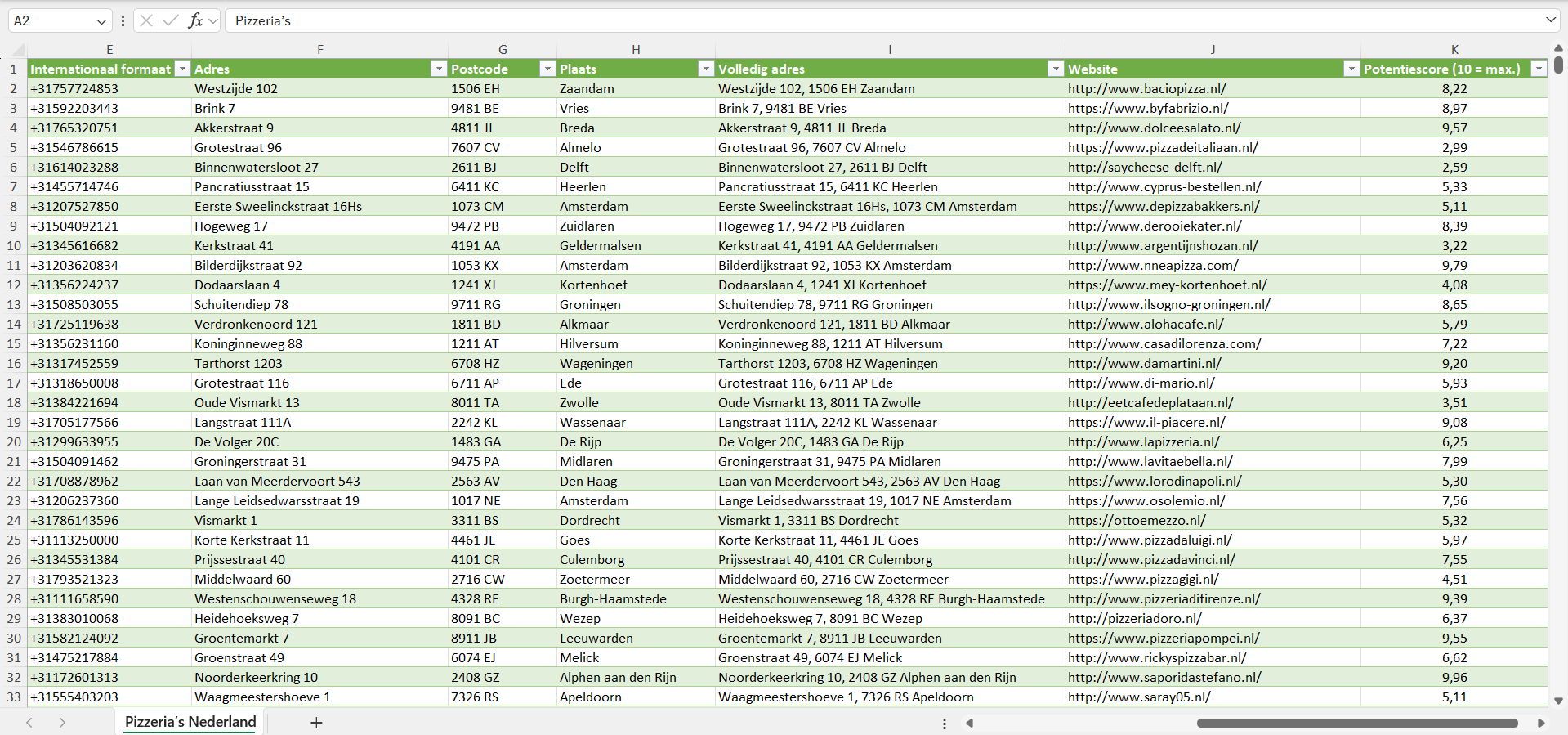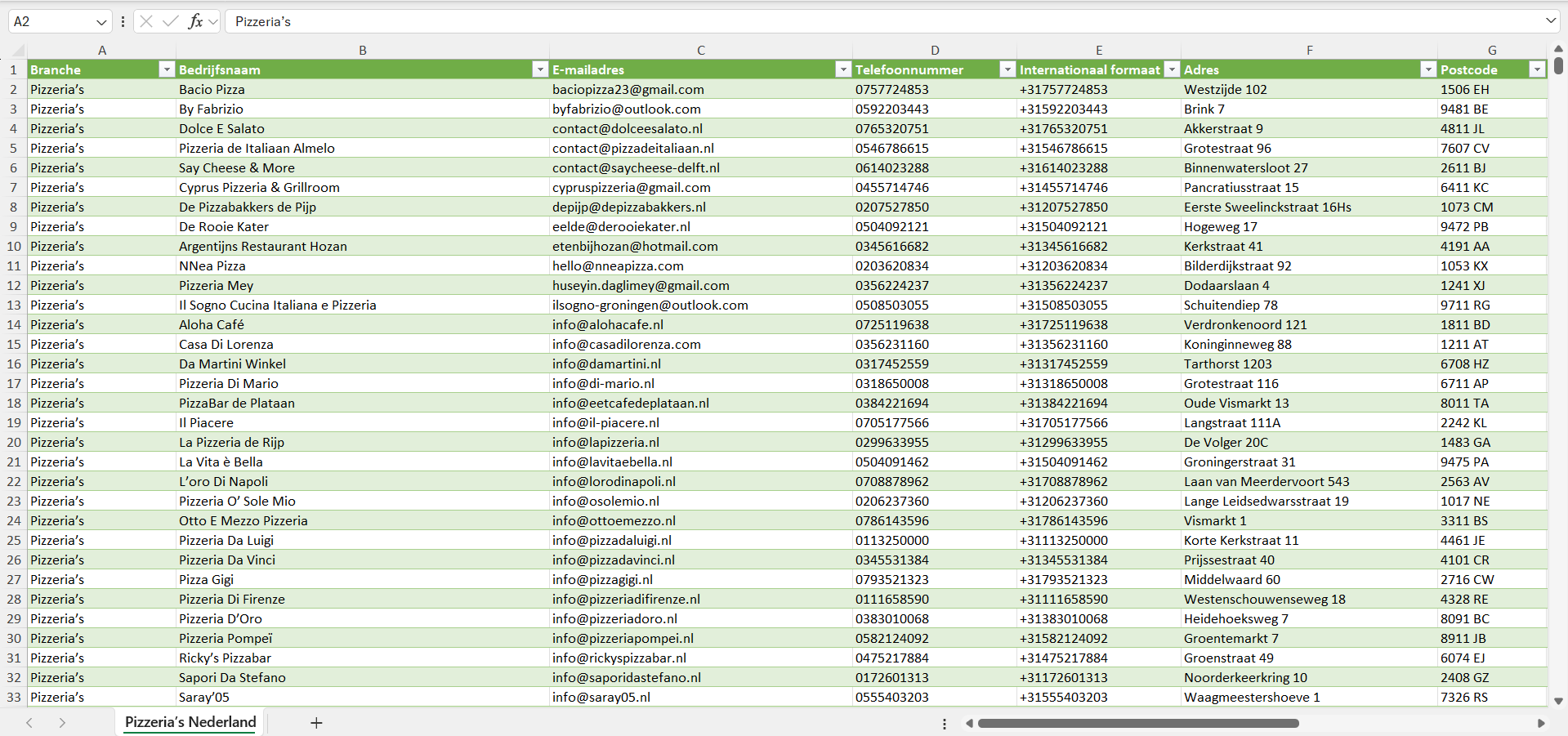 Na aankoop kun je de lijst met alle pizzeria’s in Nederland direct downloaden als Excel-bestand. Deze is geschikt voor gebruik in veelgebruikte CRM- en verkoopsoftware, zoals Salesforce, Pipedrive, HubSpot, Mailchimp, Klaviyo, ActiveCampaign en andere. Op verzoek leveren we de gegevens van de pizzeria’s ook in andere formaten, zoals CSV.