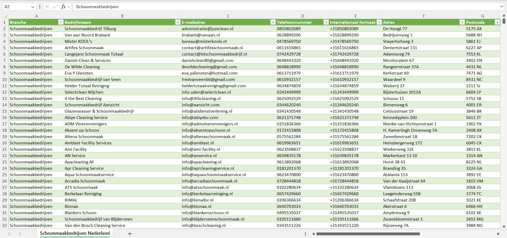 Na aankoop kun je de lijst met alle schoonmaakbedrijven in Nederland direct downloaden als Excel-bestand. Deze is geschikt voor gebruik in veelgebruikte CRM- en verkoopsoftware, zoals Salesforce, Pipedrive, HubSpot, Mailchimp, Klaviyo, ActiveCampaign en andere. Op verzoek leveren we de gegevens van de schoonmaakbedrijven ook in andere formaten, zoals CSV.