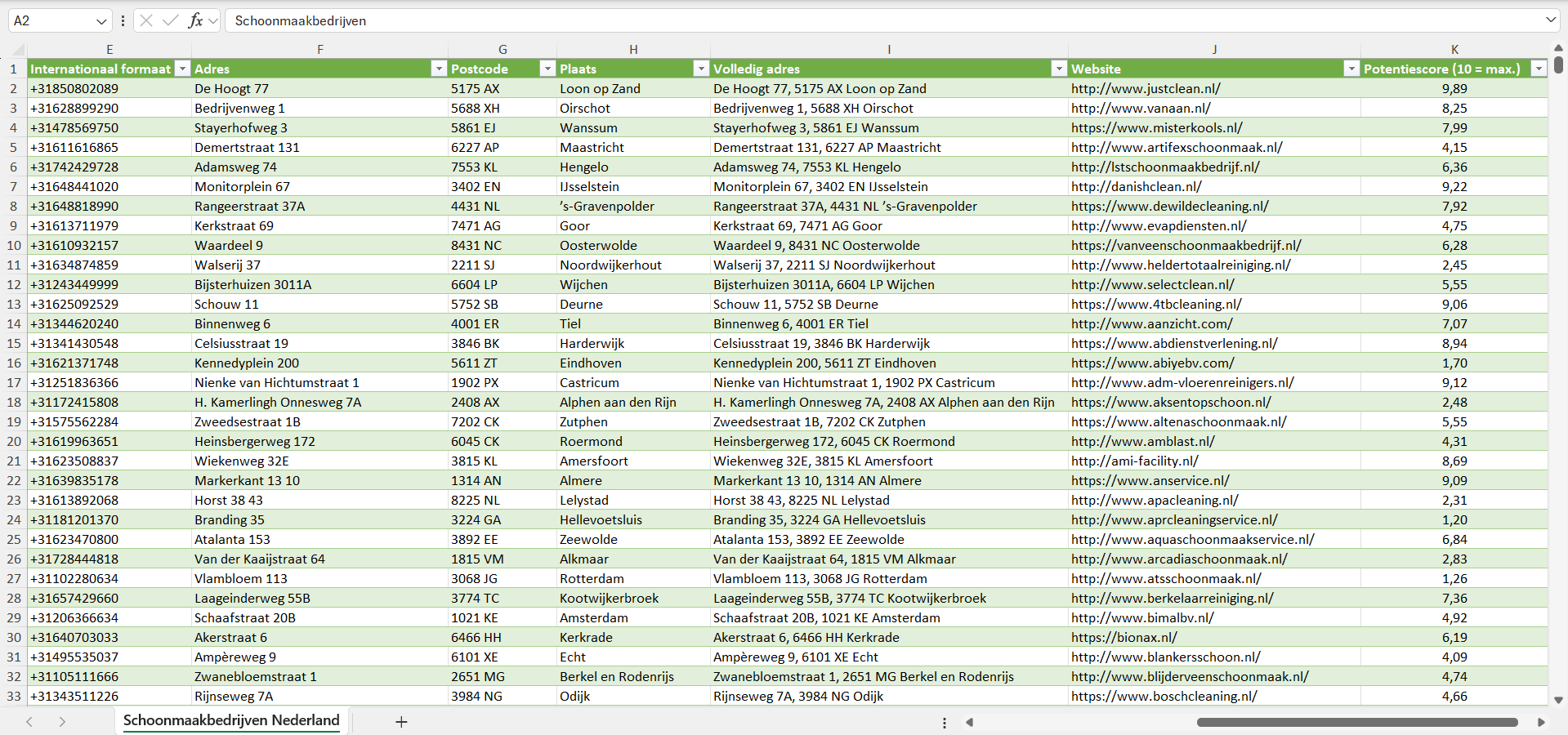 Voor elk schoonmaakbedrijf hebben we bovendien een individuele potentiescore van 1 tot 10 toegekend, gebaseerd op een reeks factoren zoals de geschatte bedrijfsgrootte, het geschatte aantal klanten en de koopkracht van de locatie.