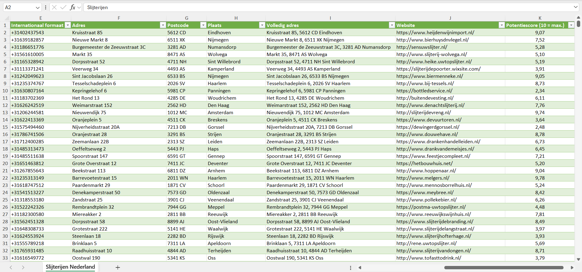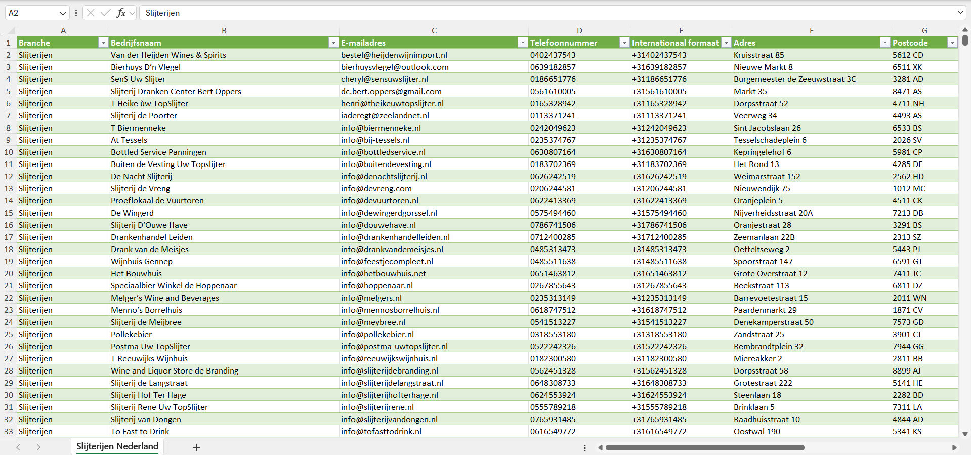 Bedrijvenlijsten.nl is opgericht door mensen uit de verkoop die zelf hebben ervaren hoe lastig het is om betrouwbare en uitgebreide zakelijke contactgegevens te vinden voor een eerlijke prijs. Omdat we onze eigen lijsten lange tijd intensief hebben gebruikt, weten we waar het in de praktijk op aankomt. Daarom leveren we een lijst van alle slijterijen in Nederland die klaar is voor direct gebruik, zodat je je ideale klanten efficiënt kunt bereiken.