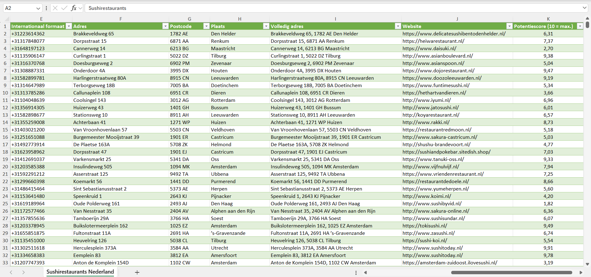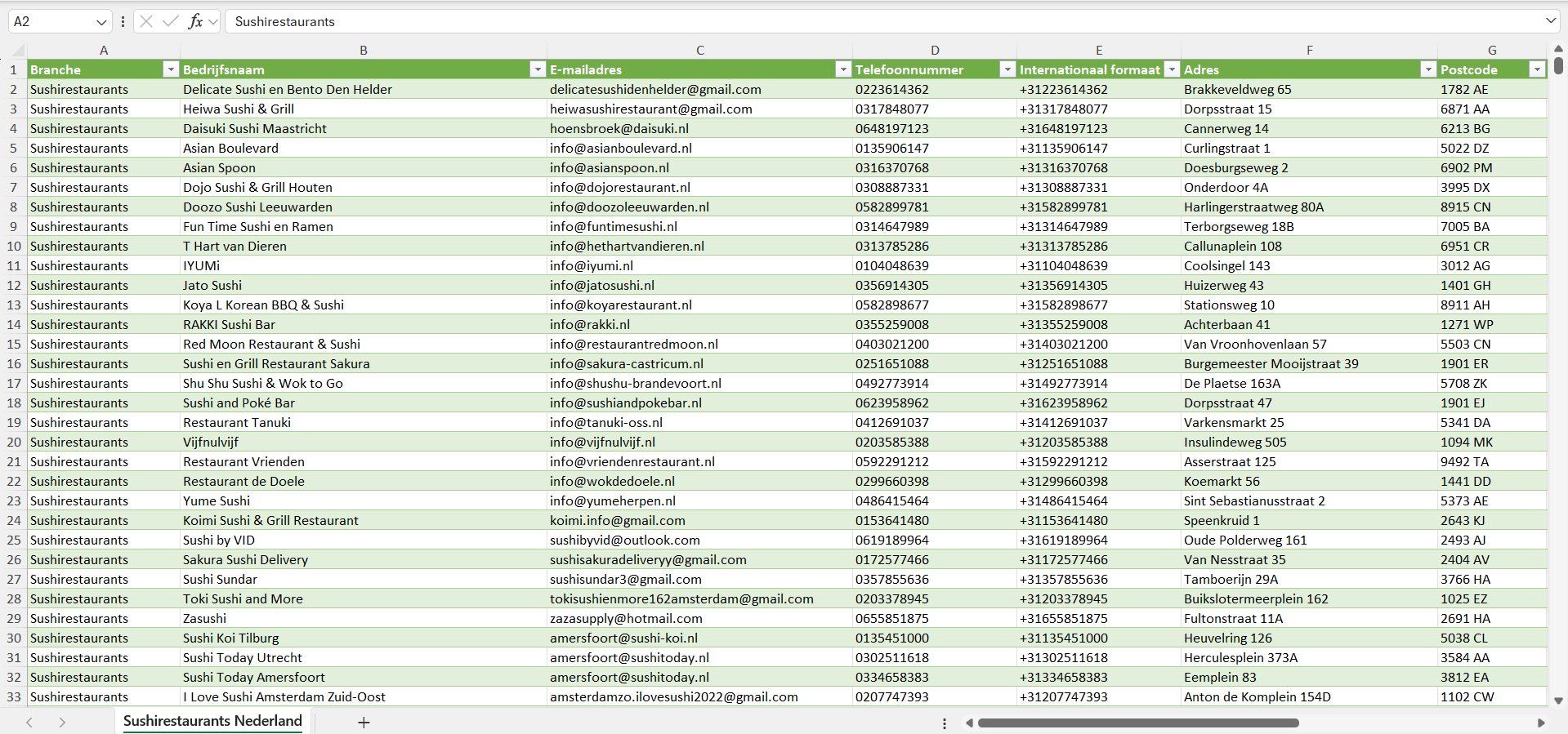 Na aankoop kun je de lijst met alle sushirestaurants in Nederland direct downloaden als Excel-bestand. Deze is geschikt voor gebruik in veelgebruikte CRM- en verkoopsoftware, zoals Salesforce, Pipedrive, HubSpot, Mailchimp, Klaviyo, ActiveCampaign en andere. Op verzoek leveren we de gegevens van de sushirestaurants ook in andere formaten, zoals CSV.
