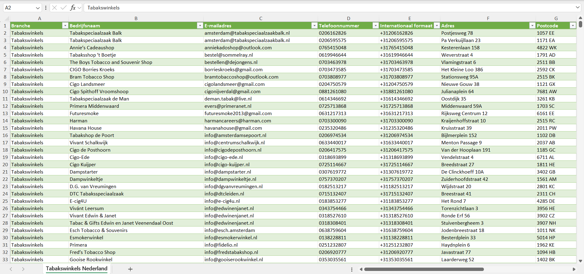 Na aankoop kun je de lijst met alle tabakswinkels in Nederland direct downloaden als Excel-bestand. Deze is geschikt voor gebruik in veelgebruikte CRM- en verkoopsoftware, zoals Salesforce, Pipedrive, HubSpot, Mailchimp, Klaviyo, ActiveCampaign en andere. Op verzoek leveren we de gegevens van de tabakswinkels ook in andere formaten, zoals CSV.