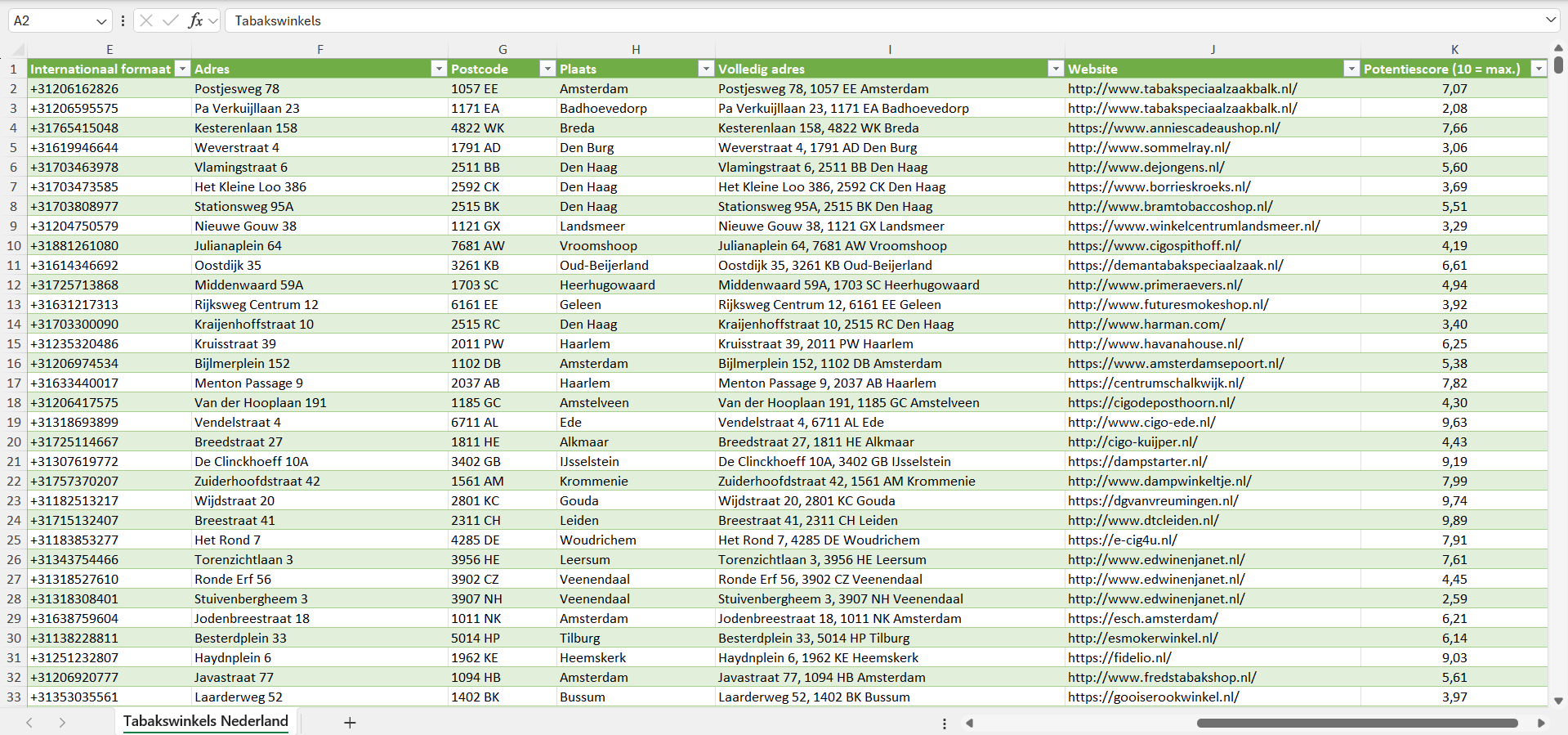 Voor elke tabakswinkel hebben we bovendien een individuele potentiescore van 1 tot 10 toegekend, gebaseerd op een reeks factoren zoals de geschatte bedrijfsgrootte, het geschatte aantal klanten en de koopkracht van de locatie.