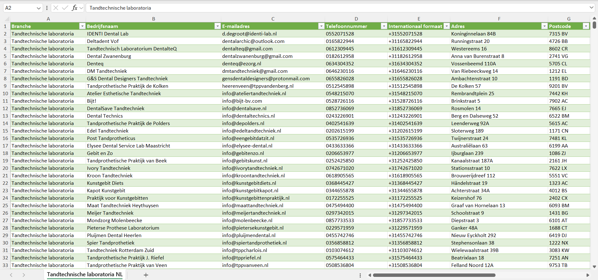 Na aankoop kun je de lijst met alle tandtechnische laboratoria in Nederland direct downloaden als Excel-bestand. Deze is geschikt voor gebruik in veelgebruikte CRM- en verkoopsoftware, zoals Salesforce, Pipedrive, HubSpot, Mailchimp, Klaviyo, ActiveCampaign en andere. Op verzoek leveren we de gegevens van de tandtechnische laboratoria ook in andere formaten, zoals CSV.