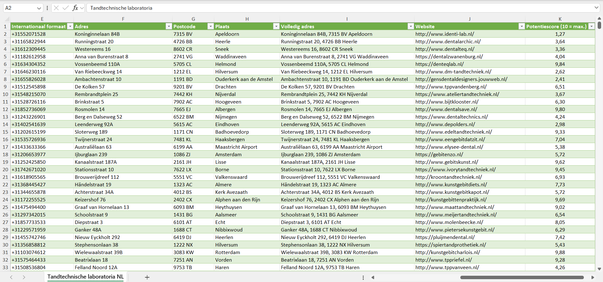 Voor elk tandtechnisch laboratorium hebben we bovendien een individuele potentiescore van 1 tot 10 toegekend, gebaseerd op een reeks factoren zoals de geschatte grootte, het geschatte aantal klanten en de koopkracht van de locatie.