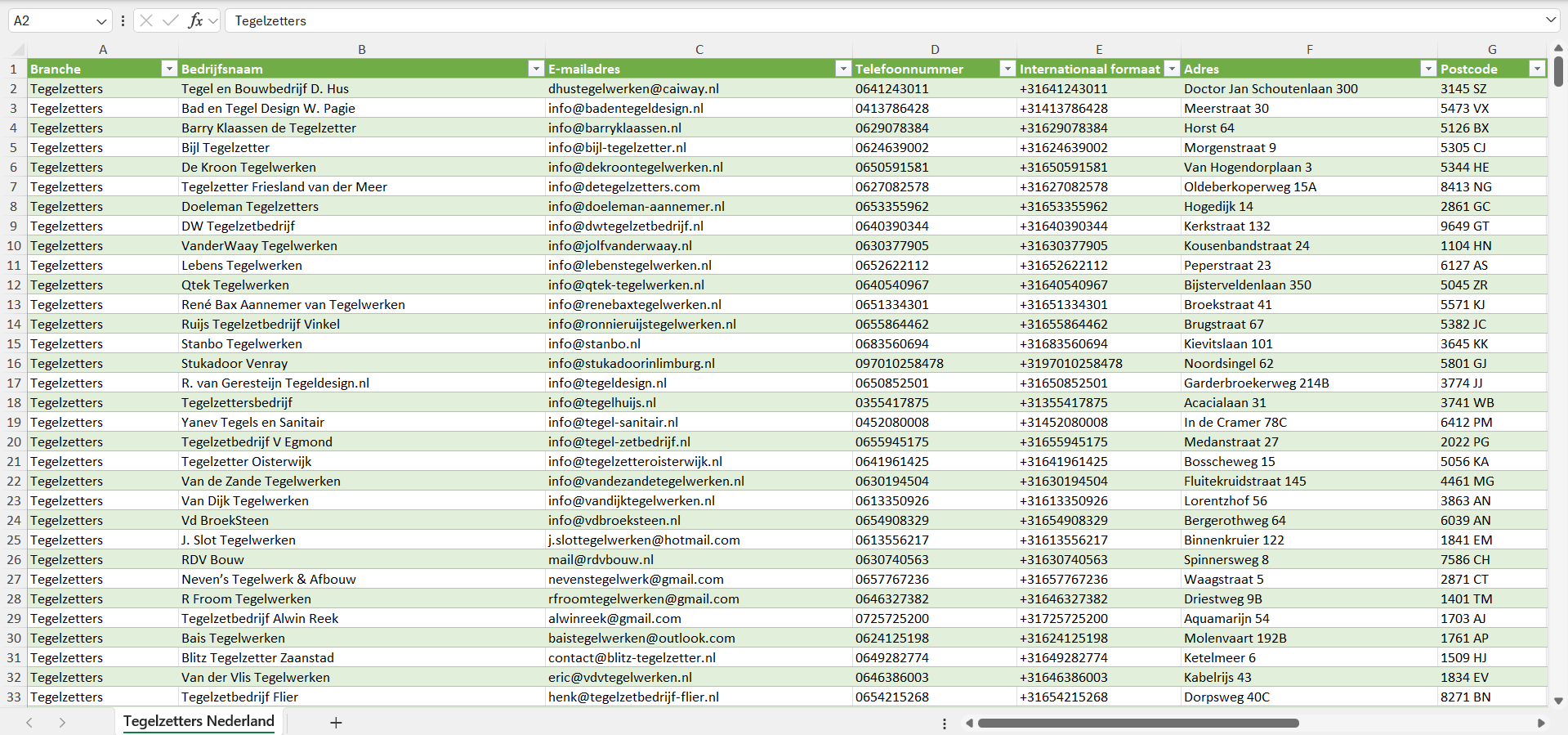 Na aankoop kun je de lijst met alle tegelzetters in Nederland direct downloaden als Excel-bestand. Deze is geschikt voor gebruik in veelgebruikte CRM- en verkoopsoftware, zoals Salesforce, Pipedrive, HubSpot, Mailchimp, Klaviyo, ActiveCampaign en andere. Op verzoek leveren we de gegevens van de tegelzetters ook in andere formaten, zoals CSV.