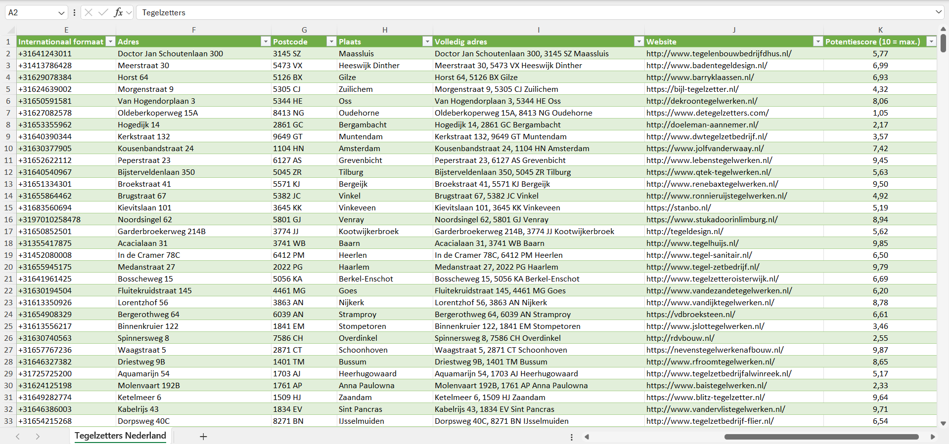 Voor elke tegelzetter hebben we bovendien een individuele potentiescore van 1 tot 10 toegekend, gebaseerd op een reeks factoren zoals de geschatte bedrijfsgrootte, het geschatte aantal klanten en de koopkracht van de locatie.