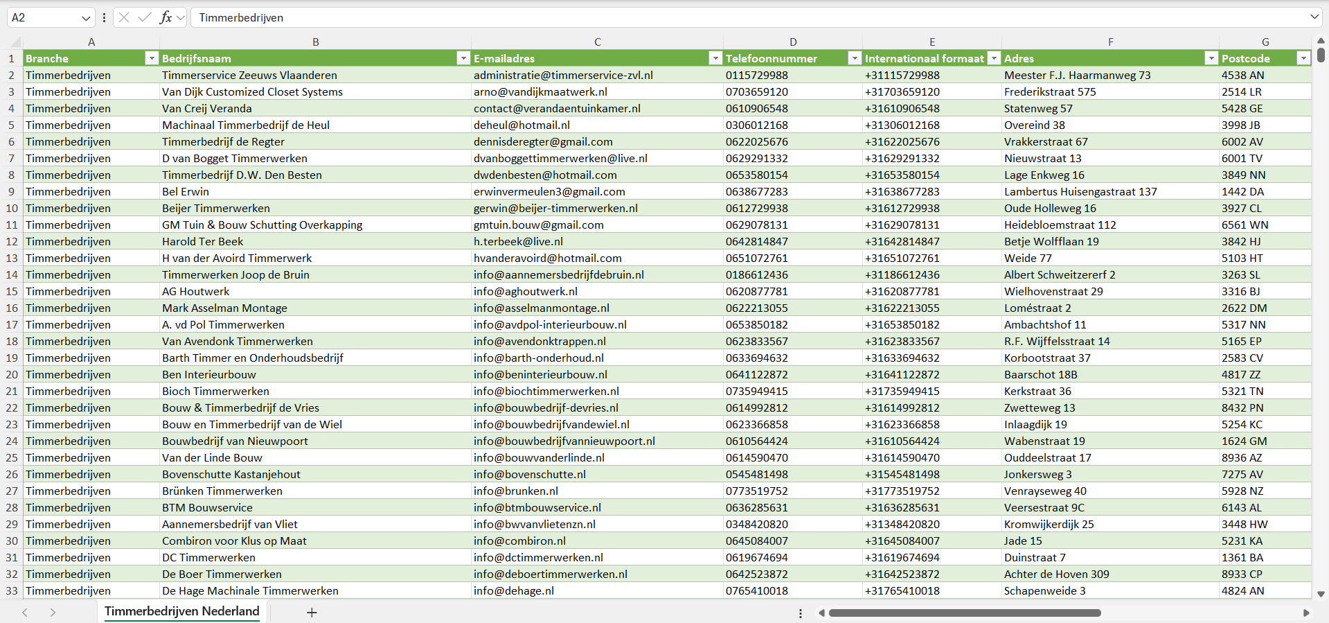Na aankoop kun je de lijst met alle timmerbedrijven in Nederland direct downloaden als Excel-bestand. Deze is geschikt voor gebruik in veelgebruikte CRM- en verkoopsoftware, zoals Salesforce, Pipedrive, HubSpot, Mailchimp, Klaviyo, ActiveCampaign en andere. Op verzoek leveren we de gegevens van de timmerbedrijven ook in andere formaten, zoals CSV.