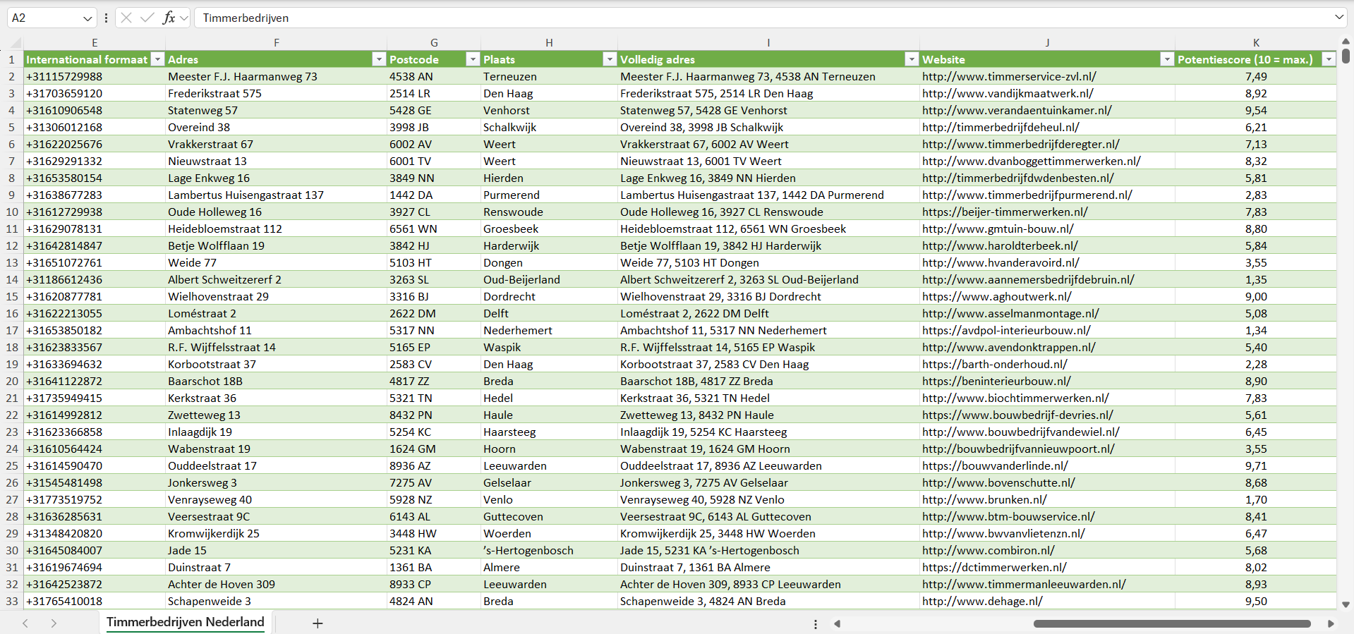 Voor elk timmerbedrijf hebben we bovendien een individuele potentiescore van 1 tot 10 toegekend, gebaseerd op een reeks factoren zoals de geschatte bedrijfsgrootte, het geschatte aantal klanten en de koopkracht van de locatie.