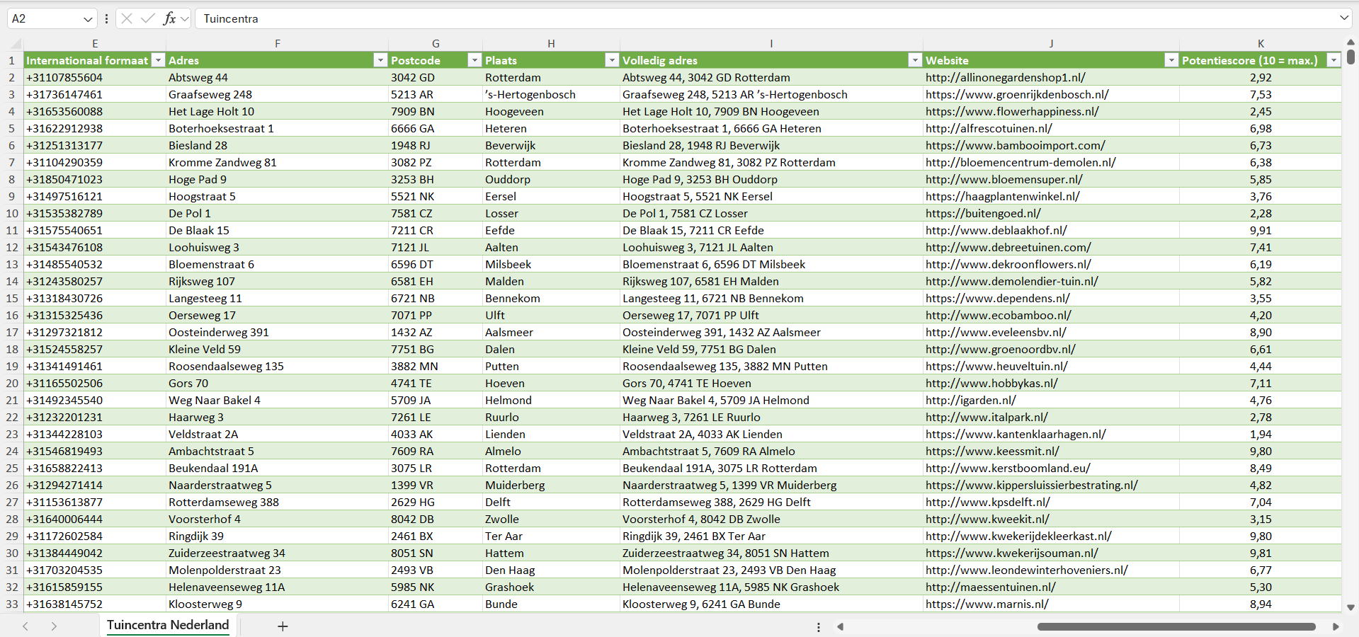 Voor elk tuincentrum hebben we bovendien een individuele potentiescore van 1 tot 10 toegekend, gebaseerd op een reeks factoren zoals de geschatte bedrijfsgrootte, het geschatte aantal klanten en de koopkracht van de locatie.